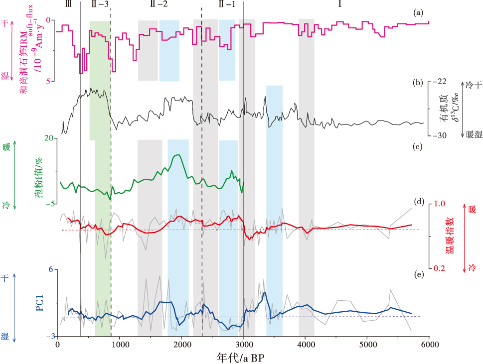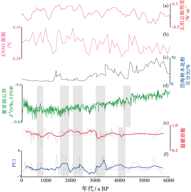 鄱阳湖地处东亚季风活动频繁区,是全新世气候变化敏感地区之一。为了重建鄱阳湖地区近5700年以来的气候演化过程并讨论其气候演化机制,以鄱阳湖ZK01钻孔内植硅体为指标,采用主成分分析方法与温暖指数划分出了3个主要的气候阶段,结果显示: (1)近5700年以来鄱阳湖地区出现了4次明显的相对干旱期和3次相对湿润期,植硅体记录对全球性事件识别较为敏感,例如4.2 ka事件和小冰期; (2)植硅体记录与响应东亚夏季风变化的石笋 δ18O 记录存在较好的对应关系,东亚夏季风强度减弱时鄱阳湖地区气候较湿润,反之则较干旱; (3)位于东亚季风区南部的鄱阳湖植硅体记录同指示降水变化的华北岱海地区树木花粉记录间具有一定可比性,显示出在中晚全新世中国东部季风区的南北方也存在反位相的降水空间格局; (4)ENSO活动对中全新世以来的鄱阳湖地区水文气候具有一定的影响,ENSO事件强度增加时期多对应着鄱阳湖气候湿润期,而ENSO事件的强度变化可能代表厄尔尼诺或拉尼娜的强度变化。